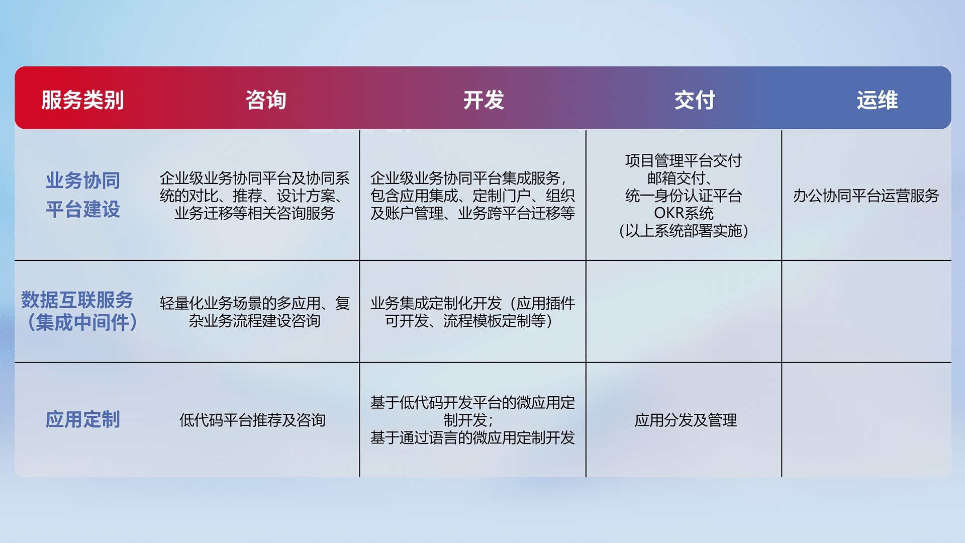 针对钉钉、、、企微、、、IDaas等平台级产品提供产品的规划、、、、方案、、交付、、定制化开发等服务,,,,实现如统一协同办公、、、智能客户服务、、、混合会议管理、、、智能数据查询、、、等业务场景,,,,实现数字化转型。。。
